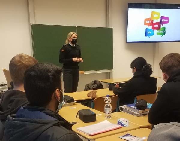 Bauer arbeitet als Jugendoffizierin und Expertin für Sicherheitspolitik bei der Bundeswehr und blickt auf Auslandserfahrung in Litauen zurück, wo vor allem die Situation zwischen der NATO und Russland in besonderem Fokus steht. Nach einem Einstiegsvortrag hatten die Schülerinnen und Schüler Gelegenheit ihre zahlreichen Fragen zu stellen, die vor allem unter dem Eindruck der Ukraine-Krise besondere Aktualität besaßen. Aber auch grundsätzliche Fragen wurden in der interessanten Debatte gestellt: So wollte Lennart Stramka wissen, wie Frau Bauer die Chancen für eine gemeinsame, europäische Armee einschätzt. Clara Schulte hatte sich bereits intensiv mit den unterschiedlichen Bereichen der Bundeswehr beschäftigt, so dass der Verteidigungsetat und die Weiterentwicklung hin zu einer modernen Armee für sie besondere Relevanz besaßen. Die Jugendoffizierin antwortete ausführlich und kenntnisreich, trennte dabei ihre persönliche Meinung von den offiziellen Positionen der Bundeswehr. Im Ergebnis entwickelte sich so ein wichtiges Gespräch über deutsche Sicherheitspolitik und deren Perspektiven und Herausforderungen im 21. Jahrhundert.